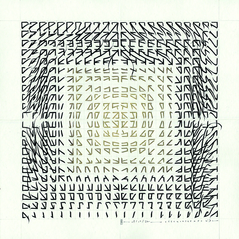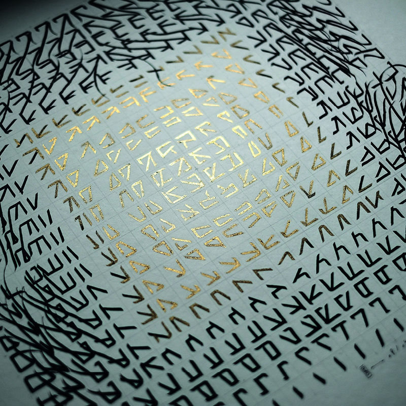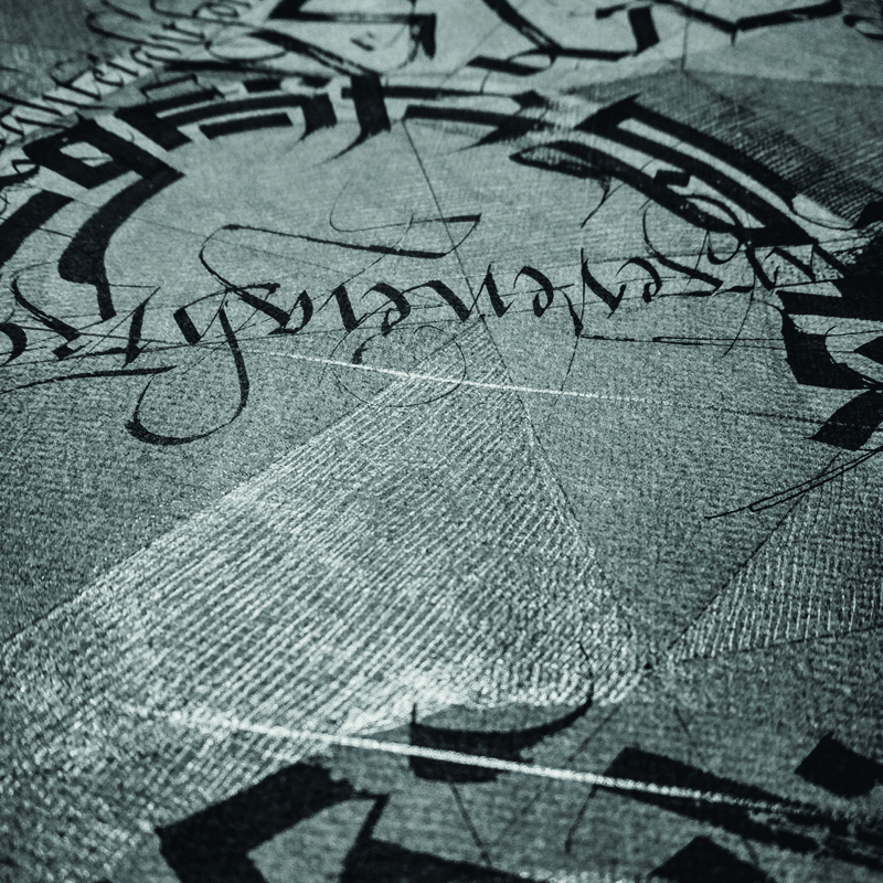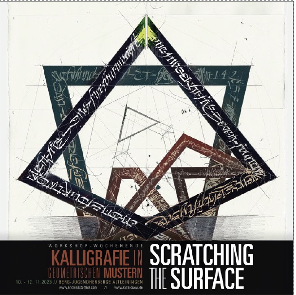 Überhaupt spielt die Geometrie seit jeher eine zentrale Rolle in der Schriftgestaltung. Wir tauchen ein in die unerschöpfliche und zeitlose Sprache versteckter Symmetrien und Rhythmen. Wir begeben uns zugleich in ein unbekanntes Terrain und verlassen doch nie die Kalligraphie. Durch die Muster begegnen wir ihr wieder und wieder aufs Neue.